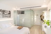Els Pins Resort & Spa offers 46 elegant Lateral Deluxe Sea View rooms. With an area of 22.40 square meters, these rooms feature a private 7-square-meter terrace equipped with two chairs and a table, ideal for relaxing while enjoying the views. Designed to accommodate up to three people, these rooms offer impressive lateral views of the harbor and the majestic Mediterranean Sea, providing a perfect retreat for rest and contemplation.